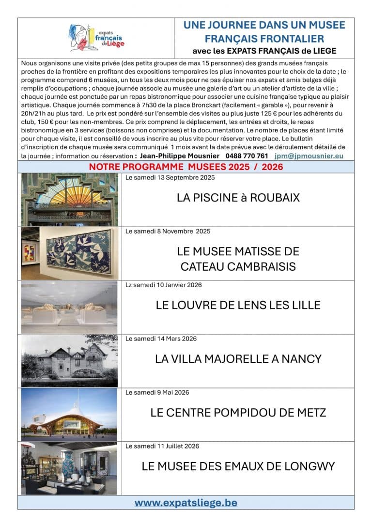 les dates du programme de visite 2025 / 2026; chacune de ces dates a été choisie en fonction des expositions temporaires et des ateliers d’artistes ouverts à coté du musée! réservez vite votre inscription, le nombre de places est limité à 15 et déja beaucoup de personnes ont réservé leur place